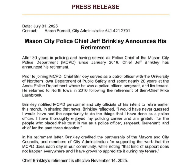 Mason City Police Chief Jeff Brinkley Announces Retirement