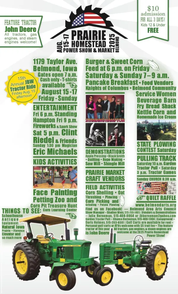 The 35th Annual Prairie Homestead Antique Power Show and Market runs Friday, August 15, through Sunday, August 17 at Prairie Homestead. Admission is $10 for the full weekend, with children 12 and under admitted free. The event showcases John Deere tractors, steam engines, and all gas engines, with live demonstrations like apple pressing, blacksmithing, quilting, rope making, sawmill and shingle mill operations, plus corn shelling, oat threshing, plowing, and potato plowing. Attendees can enjoy food vendors, live music, fireworks, tractor parades, and a magician, along with the schoolhouse, Corn Learning Center, Iowa Prairie, and Florence Elevator.