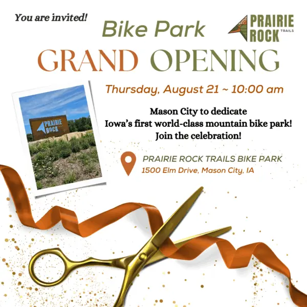 Mason City will officially open Iowa’s first world-class mountain bike park Thursday (Aug. 21) morning. The Prairie Rock Trails Bike Park sits next to Lime Creek Conservation Area and connects riders to more than 20 miles of trails and 600 acres of parkland. The 10-acre facility includes a kiddy track with paved paths, jumps and pump tracks for advanced riders, and picnic areas with public art for visitors who prefer a slower pace. Additional trails are planned later this year.