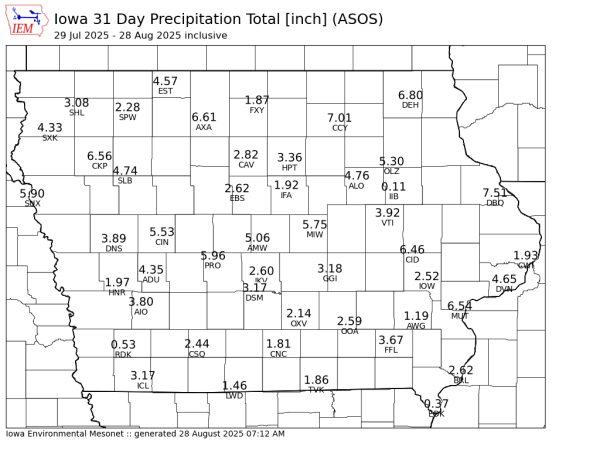 While parts of Iowa saw heavy rain earlier this month, statewide precipitation totals for August are running below average. According to the Iowa Environmental Mesonet, six of the past seven years have seen August rainfall come in under the long-term average, and 2025 appears to follow that trend. Some local areas did record above-average rain from isolated storms, but overall the statewide total remains low. The Mesonet notes a few scattered chances for rain remain as the month ends, though the majority of Iowa will likely finish August drier than normal.
