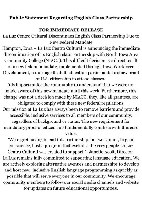 La Luz Centro Cultural announced today that it is immediately discontinuing their English class partnership with North Iowa Area Community College. The decision comes after a new federal mandate implemented through Iowa Workforce Development that requires all adult education participants to show proof of U.S. citizenship to attend class.