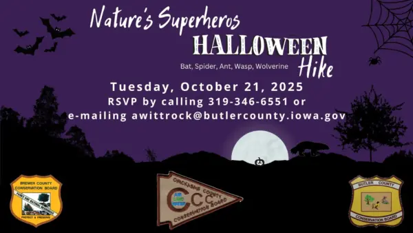The Halloween Hike in Chickasaw County will be October 14th and the hike in Bremer County is scheduled for October 26th. The theme for this year’s hikes is “Nature’s Superheroes.” Wittrock says attendees will learn about animals that have the same, or similar, names as some of the superheroes you would see in movies and TV.