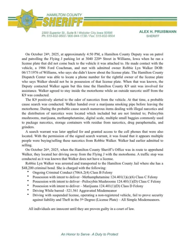 According to a news release from the sheriff’s office, on Oct. 24 around 4:50 p.m., a deputy on patrol near the Flying J in Williams stopped a vehicle with a license plate that didn’t match the vehicle it was attached to. The driver, identified as Robbie Lyn Walker, 49, of Williams, was contacted, and a K-9 unit later detected the odor of narcotics coming from the vehicle — a 1986 Ford Coachman motorhome.