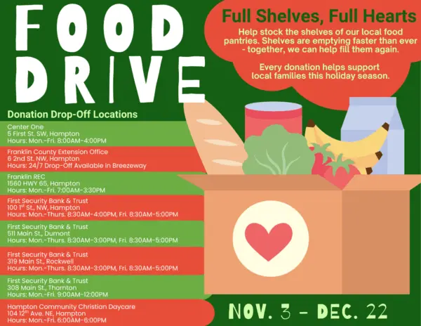 A group of Franklin County organizations are teaming up to support local families this holiday season. Franklin REC, Center One, the Franklin County Extension Office, Hampton Community Christian Daycare, and First Security Bank & Trust locations in Hampton, Dumont, Rockwell, and Thornton have launched the “Full Shelves, Full Hearts” food drive.