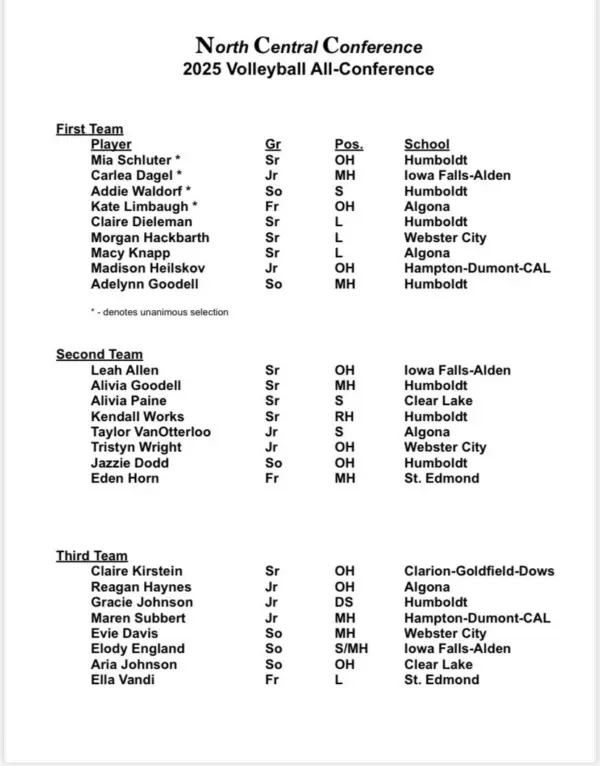 The North Central Conference all-conference volleyball teams have been announced. Local selections: