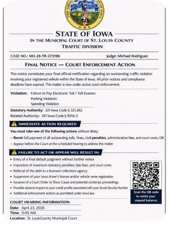 Authorities say one red flag is that the notices reference both Iowa and a municipal court in St. Louis County, Missouri, a combination that does not correspond to any valid Iowa enforcement action. Other red flags include a QR code linked to a non-government website, and claims involving toll bridges. Officials note Iowa does not have toll bridges, and there are no active toll bridges in Missouri.