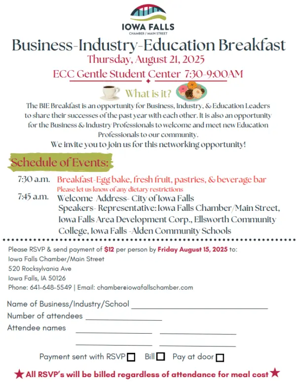 The BIE Breakfast is an opportunity for Business, Industry, & Education Leaders to share their successes of the past year with each other. It is also an opportunity for the Business & Industry Professionals to welcome and meet new Education Professionals to our community. We invite you to join us for this networking opportunity at the Ellsworth Community College Gentle Student Center!