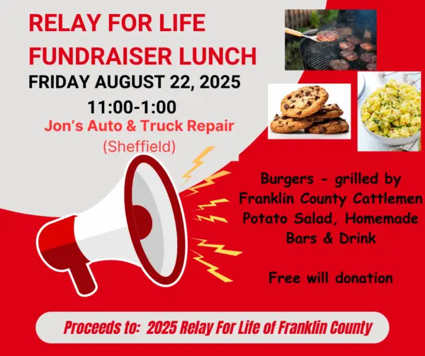 Relay For Life fundraiser lunch held at Jon’s Auto and Truck Repair in Sheffield. Hamburgers grilled by Franklin County Cattlemen, potato salad, homemade bars & drink