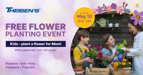 Bring the family for a free planting event at Theisen’s. We will provide a flower, soil and a pot. Every participant gets a coupon to use in store.