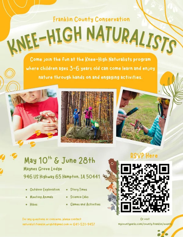 The Knee High Naturalists Program is BACK!!! After some consideration, this program has been moved to a Saturday morning. Knee High Naturalist is a monthly program for ages 2-6 to learn and get engaged with the environment through hands on activities. These programs are free but parental supervision is required. To learn more and to RSVP, please scan the QR code or use the link in the flyer above.