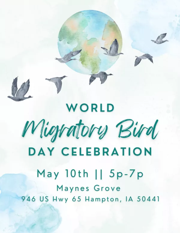 Join us to celebrate World Migratory Bird Day May 10th! Birds are fascinating creatures with many species migrating twice a year, flying hundreds to thousands of miles. Come celebrate our Migratory birds during this two hour event! Learn about the fascinating nature of bird migration, what bird species migrate in and out of Iowa, make your own bird craft, creating bird life list, and a bird watching hike! This event is open to all ages and is FREES. RSVP is NOT required.